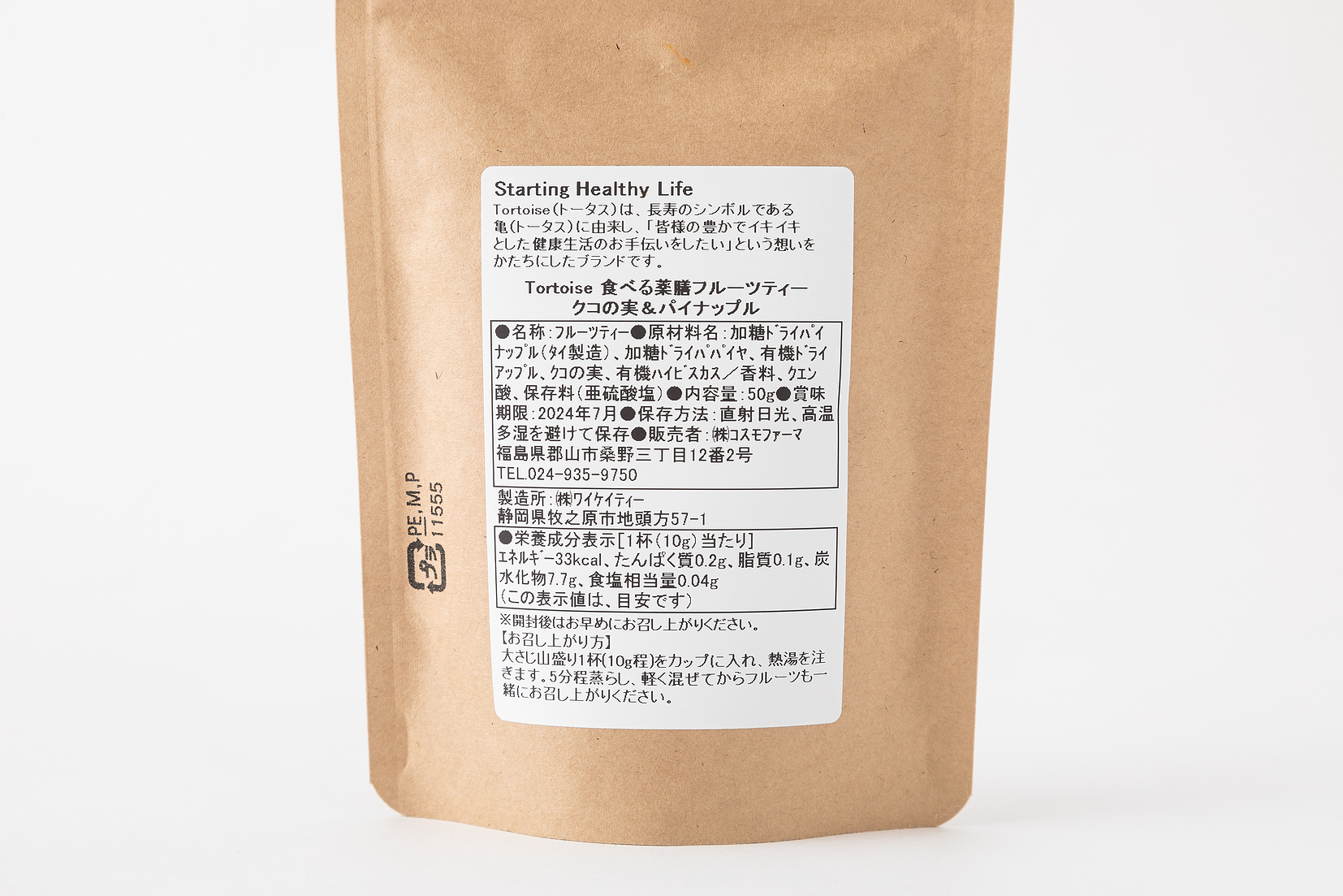 世界三大美女の一人「楊貴妃」も 愛用していたといわれるクコの実 パイナップルの甘みと爽やかな香り 商品名:Tortoise食べる薬膳フルーツティー クコの実&パイナップル 原材料名:加糖ドライパイナップル(タイ製造)、加糖ドライパパイヤ、有機ドライアップル、クコの実、有機ハイビスカス/香料、クエン酸、保存料(亜硫酸塩) 内容量:50g 賞味期限:製造より2年 未開封で2か月以上賞味期限がある状態でお届けします 保存方法:直射日光、高温多湿を避けて保存 製造者:(株)ワイケイティー 静岡県牧之原市地頭方57-1 栄養成分表示[1杯(10g)あたり] エネルギー:33kcal/タンパク質:0.2g/脂質:0.1g/炭水化物:7.7g/食塩相当量:0.04g 【お召し上がり方】 ホット:大さじ山盛り1杯(10g程)をカップに入れ、熱湯(100cc)を注ぎます。5分程蒸らし、軽く混ぜてからフルーツも一緒にお召し上がりください。 アイス:カップ1杯分(150cc)につき、大さじ2杯をポットに入れ、熱湯を注ぎ約5分蒸らします。氷を入れたグラスへ注いで完成です。フルーツもポットから出してお召し上がりいただけます。 ●開封後はお早めにお召し上がりください。 ●食べる薬膳フルーツティー・メディカルケースは、甘ざけ・飲むお酢と同時注文が不可となっております。 ●甘ざけ・飲むお酢をご注文される場合は、注文完了後再度ご注文手続きをお願いいたします(別途送料がかかります)