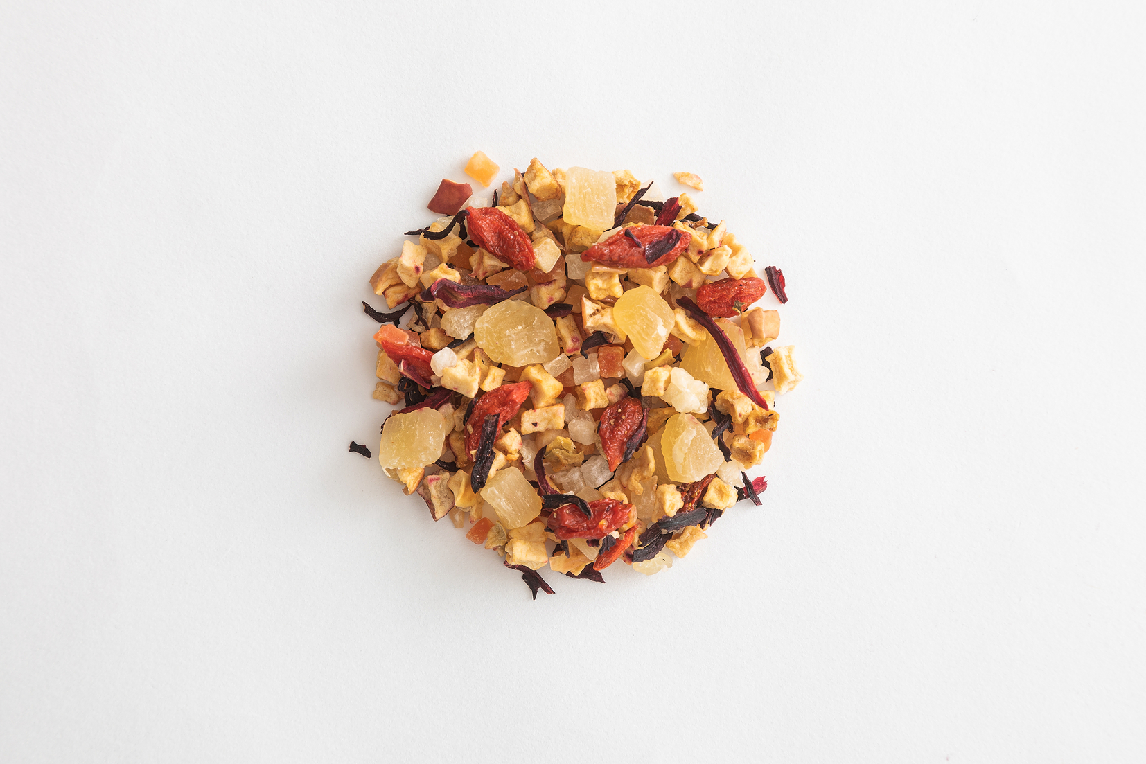 原材料名:加糖ドライパイナップル(タイ製造)、加糖ドライパパイヤ、有機ドライアップル、クコの実、有機ハイビスカス/香料、クエン酸、保存料(亜硫酸塩)