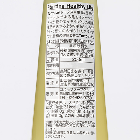 柚子のさわやかな香りが特徴。 水またはお湯で4倍程度に薄めてお飲みください。 商品名:柚子と生姜の飲むお酢 原材料名:砂糖(国内製造)、ゆず、りんご酢、生姜、香辛料 内容量:200ml 賞味期限:製造より12ヵ月 未開封で2か月以上賞味期限がある状態でお届けします 保存方法:開封後は冷蔵庫に保管し、お早めにお召し上がりください 製造者:山二造酢株式会社 三重県津市阿漕町津興2476 栄養成分表示(大さじ1杯(15ml)あたり) エネルギー:31kcal/タンパク質:0g/脂質:0g/ 炭水化物:8g/食塩相当量:0g ●浮遊物、沈殿物が生じることがありますが、原材料由来の成分ですので、安心してお飲みください ●人工甘味料不使用 ●甘ざけ・飲むお酢は、メディカルケース・食べる薬膳フルーツティーと同時注文が不可となっております ●メディカルケース・食べる薬膳フルーツティーをご注文される場合は、注文完了後再度ご注文手続きをお願いいたします(別途送料がかかります)
